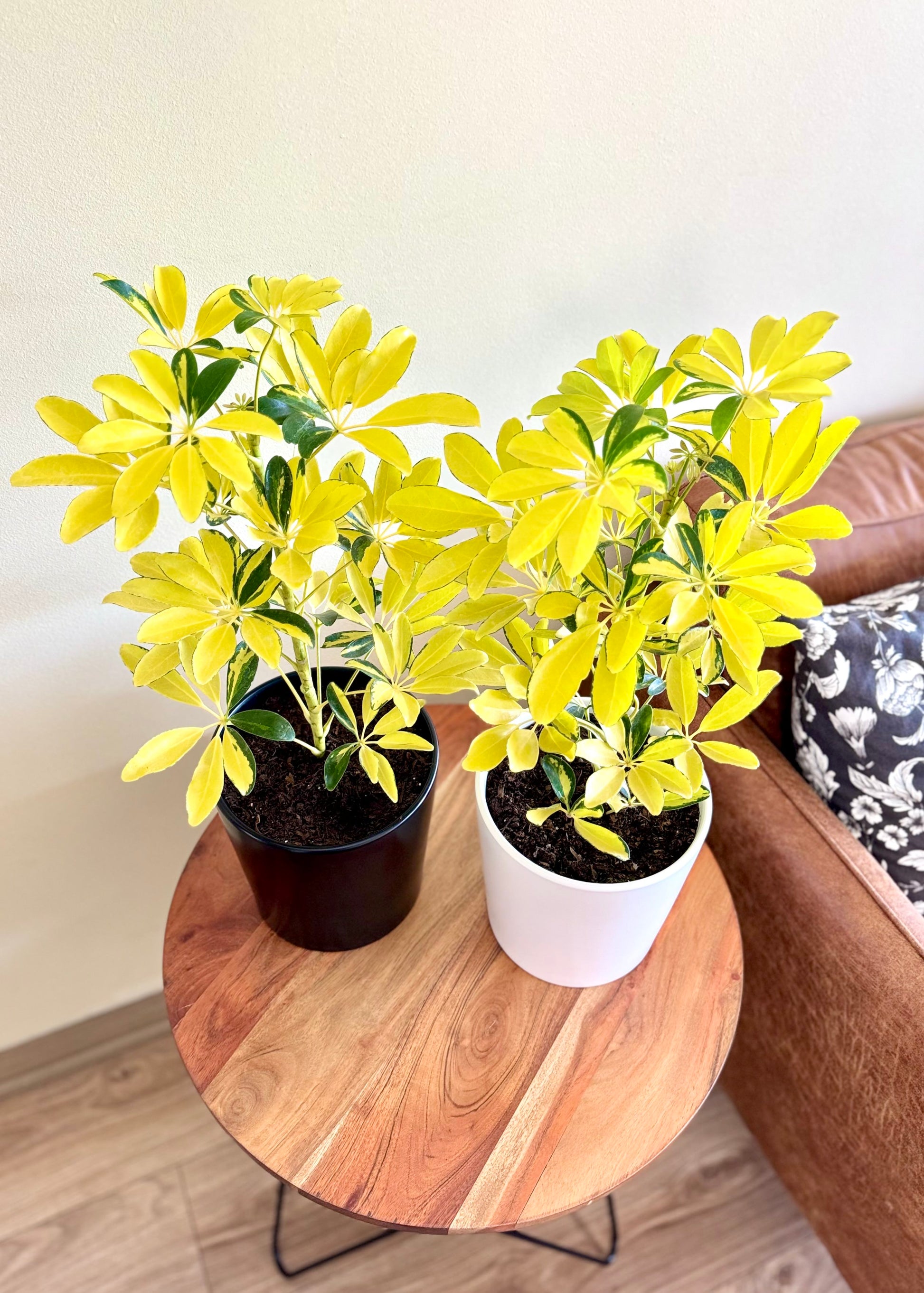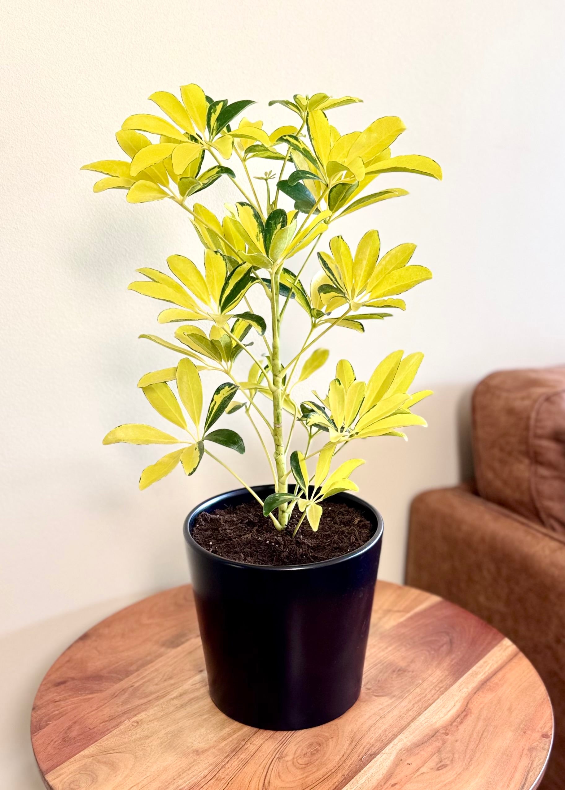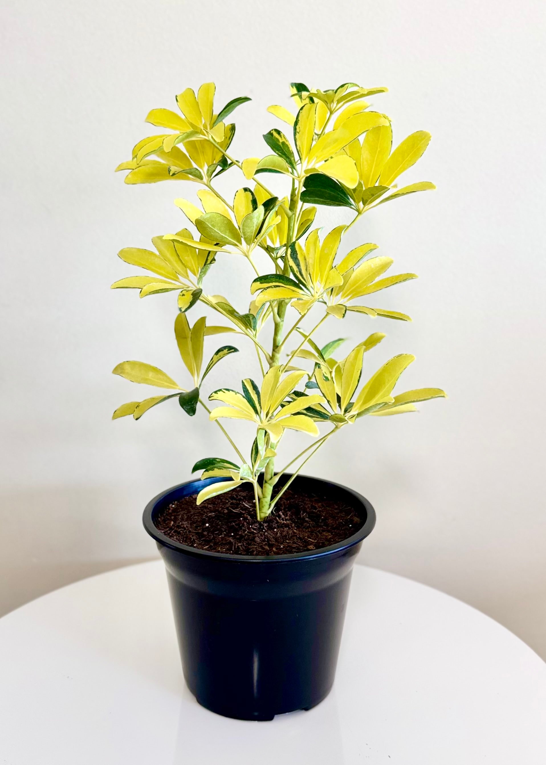 La Cheflera Golden o Sol es una variedad muy popular por su follaje variegado, que combina el verde oscuro con amarillo intenso 💛🌿