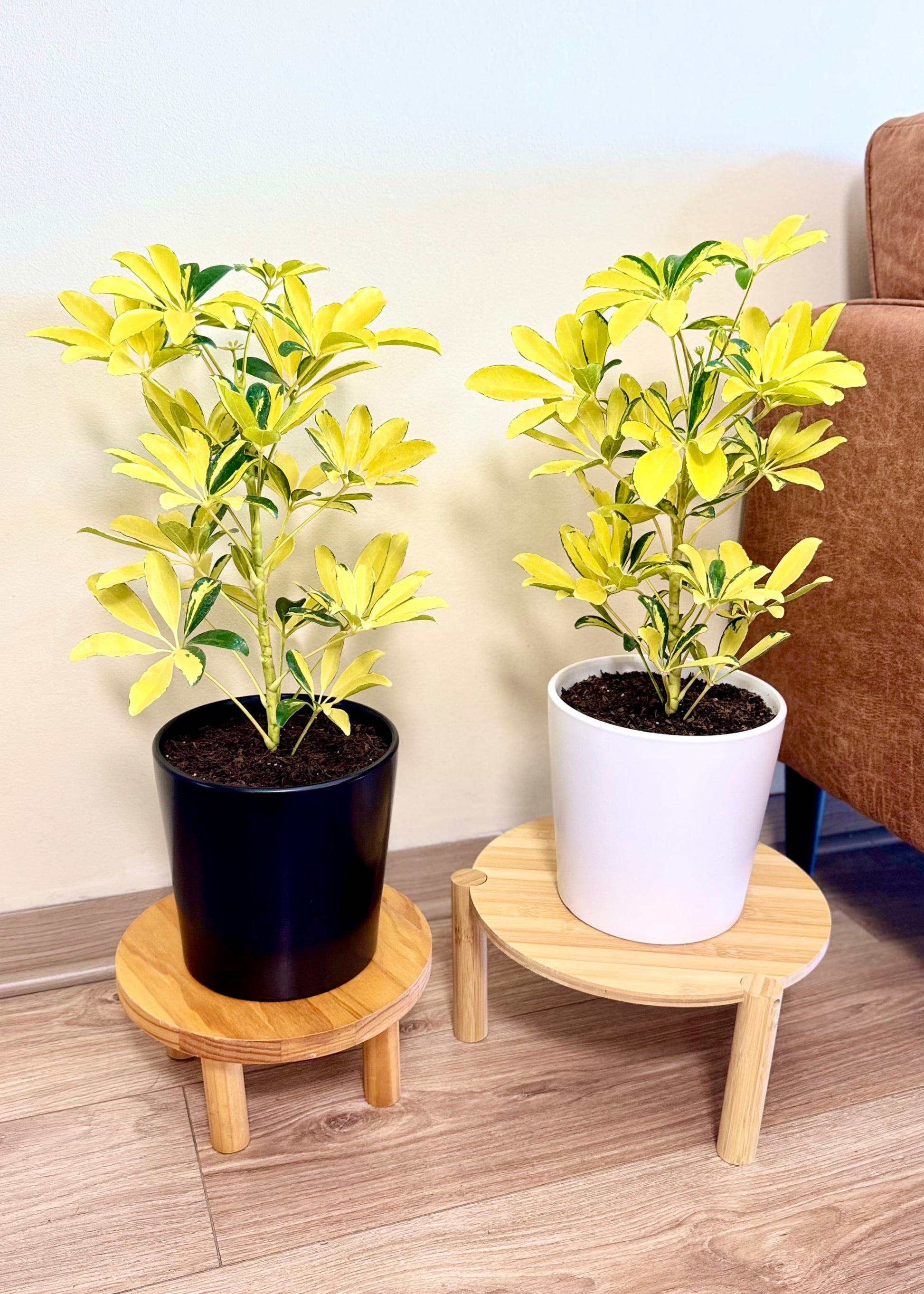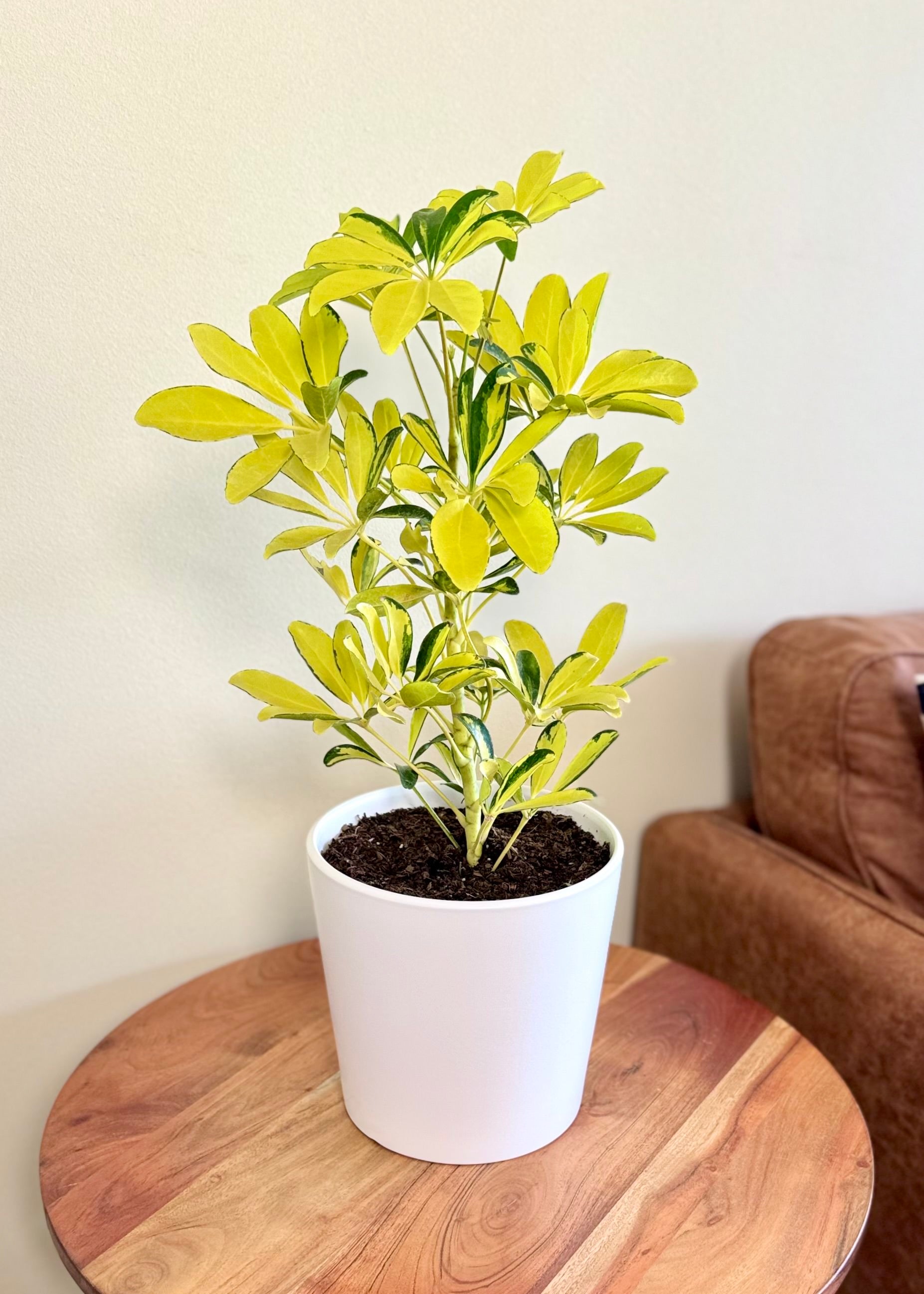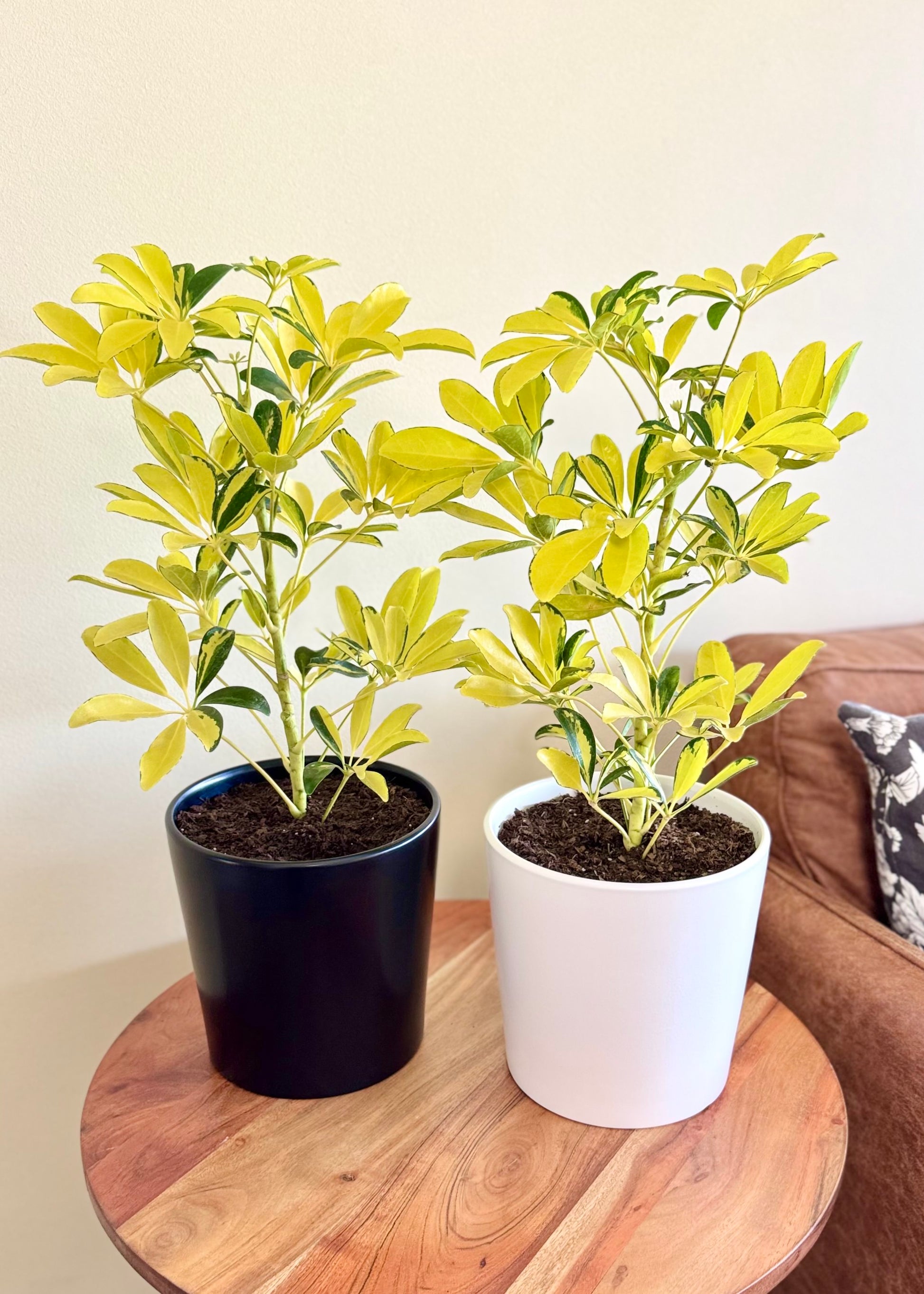La Cheflera Golden o Sol es una variedad muy popular por su follaje variegado, que combina el verde oscuro con amarillo intenso 💛🌿