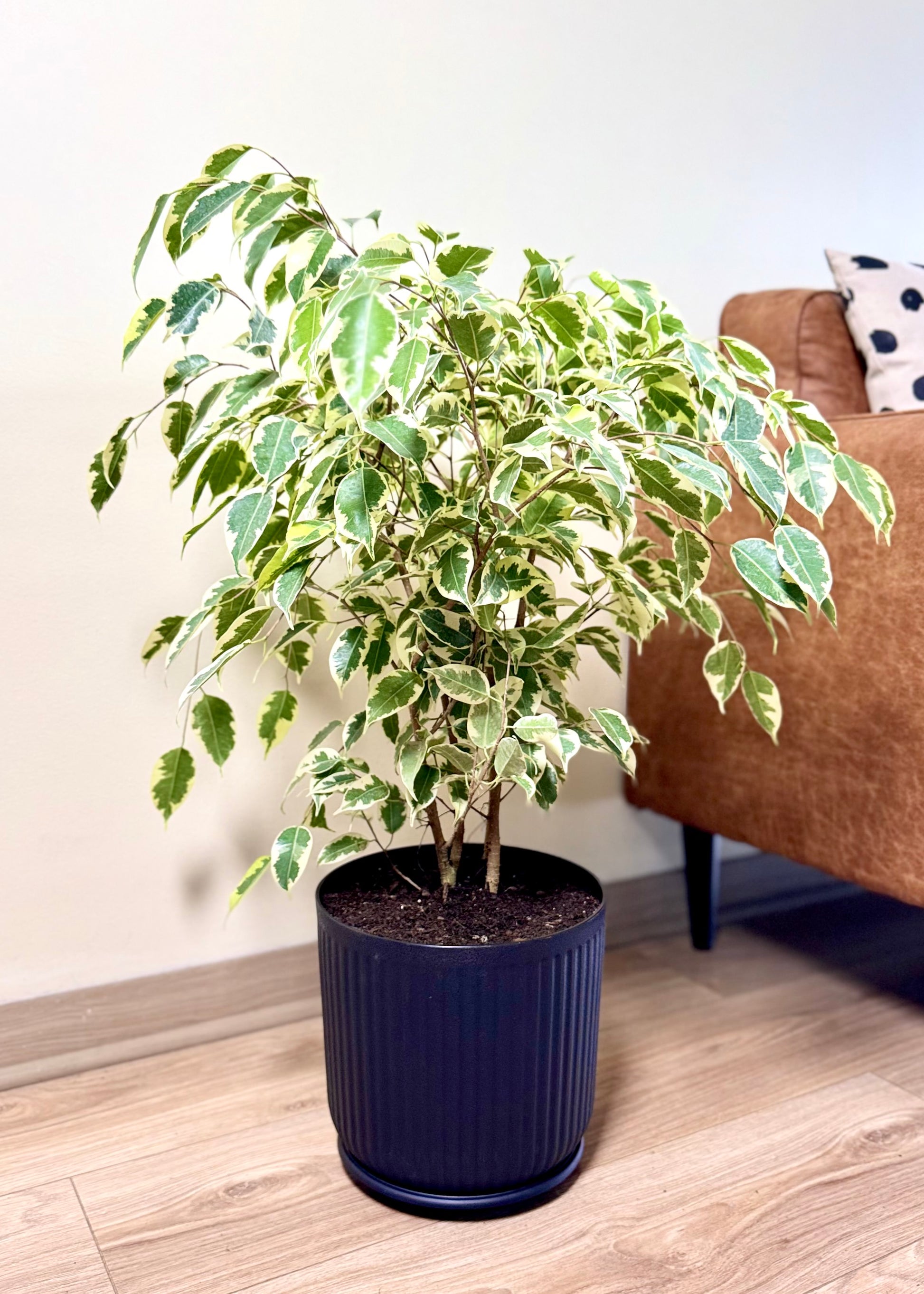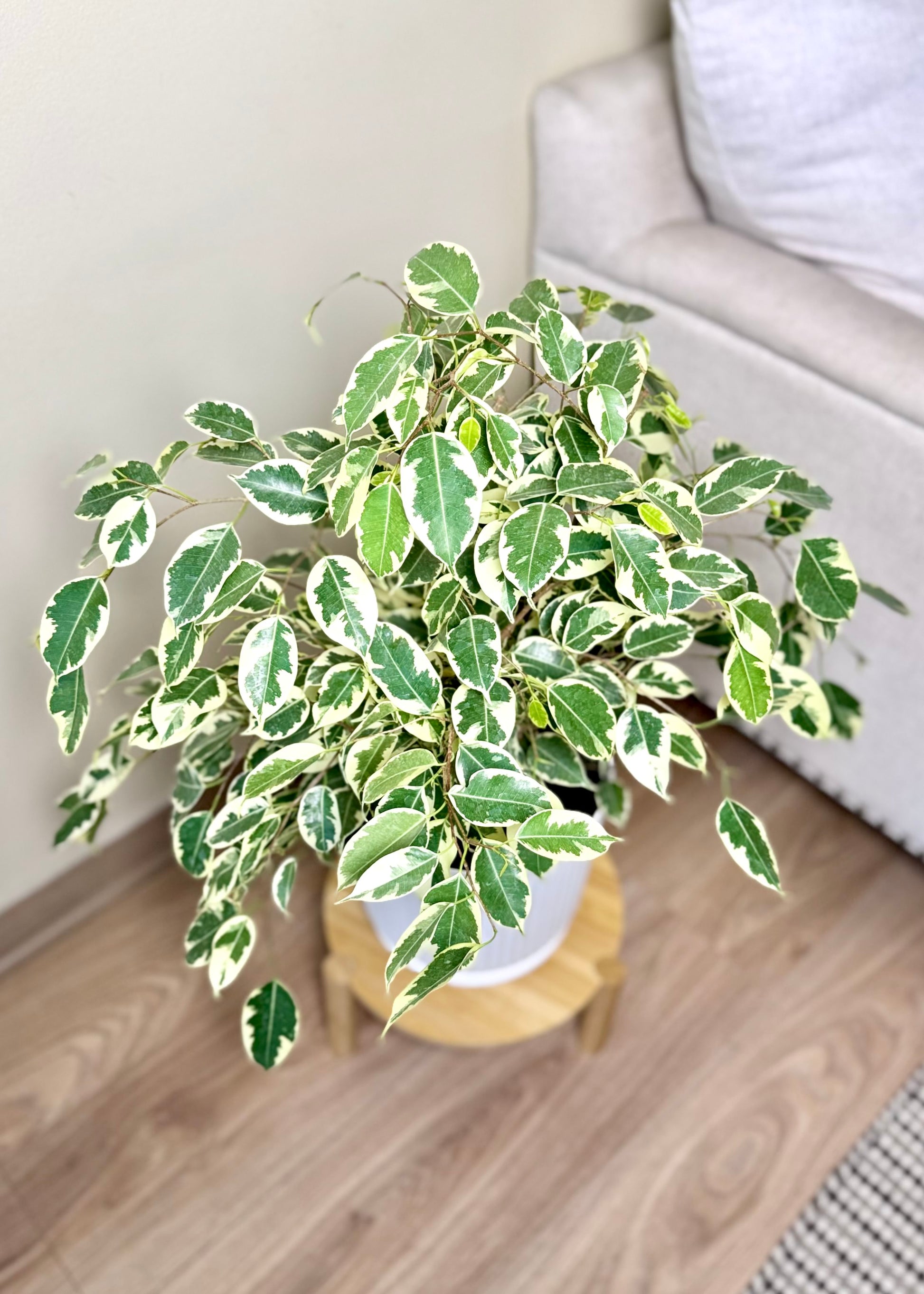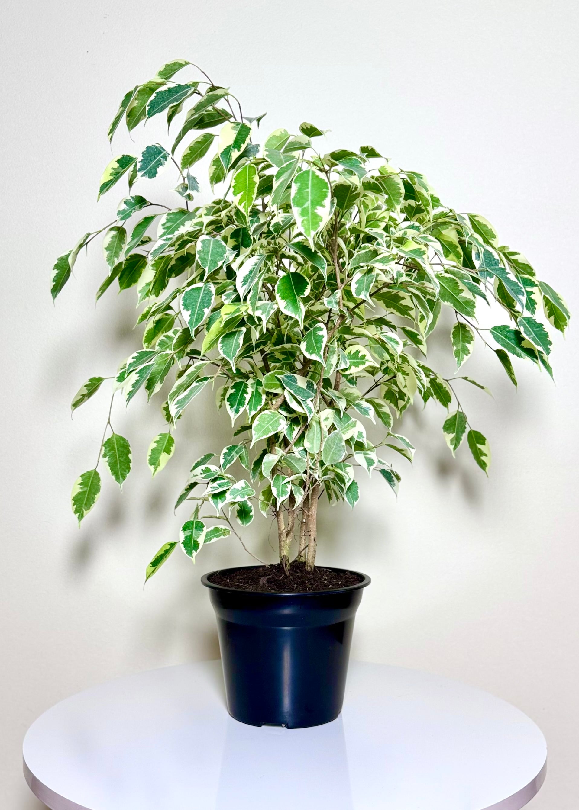 El Ficus Variegado es una planta de interior muy decorativa, conocida por su elegante follaje verde con bordes crema o blanco, que aporta luz, contraste y frescura a cualquier rincón 💚🤍