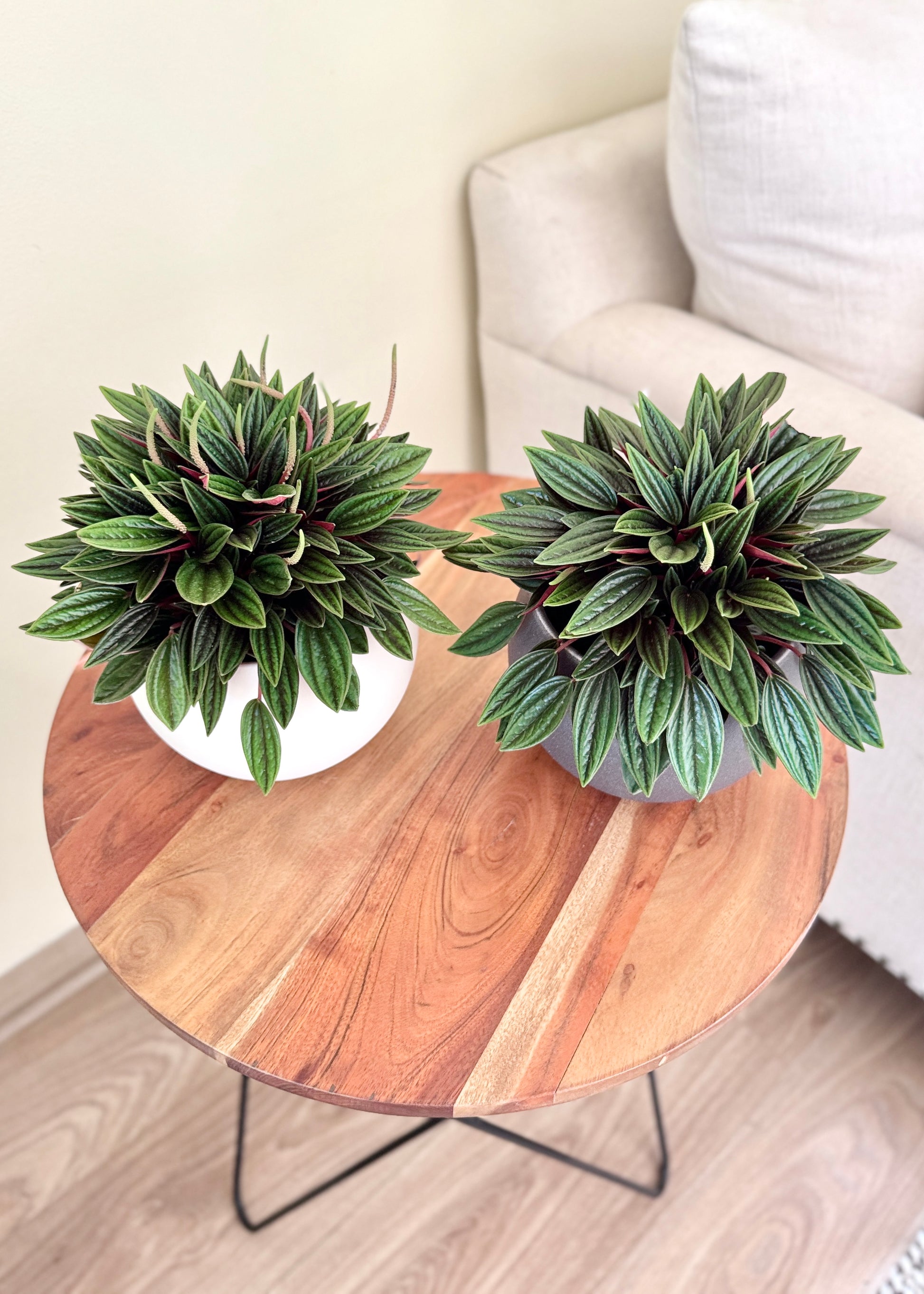 La Peperomia Rosso es una planta pequeña pero llena de estilo 💚. Sus hojas puntiagudas de color verde oscuro por encima y rojo intenso por debajo le dan un look muy especial, perfecto para darle un toque decorativo a escritorios, repisas o mesas de noche ✨.
